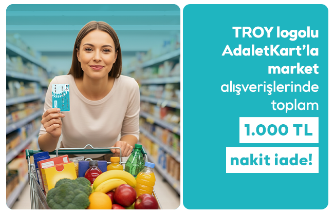 TROY logolu Adalet Kart ile yapacağınız market alışverişinde %10 nakit iade fırsatı sizi bekliyor.