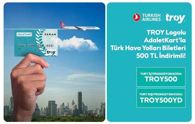 TROY Logolu AdaletKart’la Türk Hava Yolları’ndan alacağınız yurt içi ve yurt dışı biletlerinde 500 TL indirim fırsatı sizi bekliyor.
